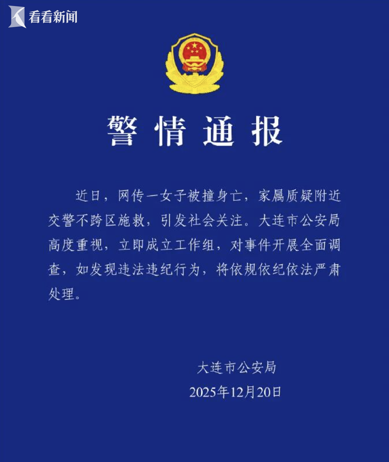 12月20日,辽宁省大连市公安局发布警方通报:近日,网络报道称,一名女子被撞身亡。家人质疑附近交警未过区救人,引发社会关注。大连市公安局对此高度重视,立即成立工作组,对事件进行全面调查。发现有违法违纪行为的,将按照规定和纪律严肃处理。据此前媒体报道,辽宁大连普兰店区啤酒节当晚,卢女士在附近金州区被车撞身亡。一名 13 岁男孩眼睁睁地看着自己的母亲被压碎。死者家属称附近有普兰店交警,但因不在他们管辖范围内,没有参与救援。这所辖交警赶到较晚,卢女士最终因伤重不治身亡。家属无法想象,附近执勤的交警为什么不帮忙。目击者先生也报了警。沉先生随后也证实了此事,“人的生命是第一位的,这种事故已经发生了,即使你没有责任去照顾,你也应该有义务去照顾。你可以帮忙协调,尽快找到车辆来救人,这个人不会死。”针对家属的疑问,普兰店交警回应称,事故现场的人可能是正在执勤的警察。既然发生了人员伤亡,事故警察一定是在发生的编辑:范燕飞编辑:陈毅